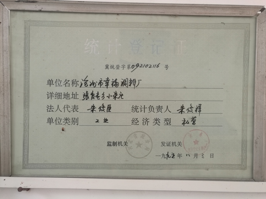 統(tǒng)計登記證 冀統(tǒng)登字第092102116號 單位名稱滄州市幸福調(diào)料廠 詳細(xì)地址張官屯鄉(xiāng)小朱莊 發(fā)證機關(guān):滄縣統(tǒng)計局 監(jiān)制機關(guān):河北省統(tǒng)計局 一九九五年八月三日