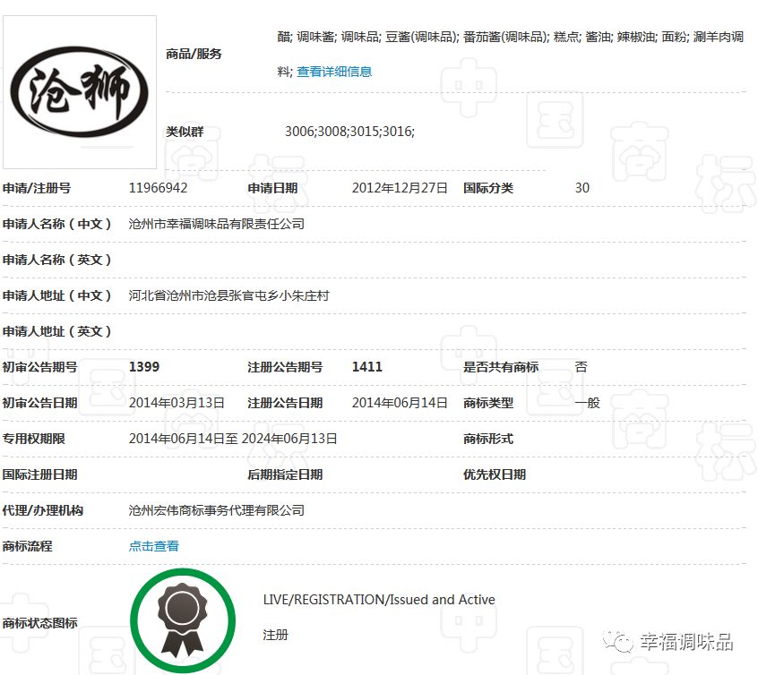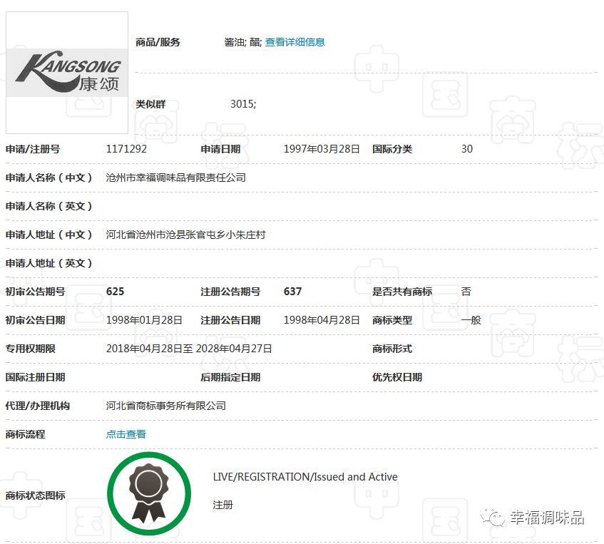 幸福調(diào)味品自創(chuàng)辦30多年以來,在工商部門指導(dǎo)下,充分認(rèn)識到商標(biāo)品牌的重要性,始終堅持走創(chuàng)品牌的路子。公司的“康頌”商標(biāo)于1997年在30類,糖、茶、糕點(diǎn)、調(diào)味品類獲核準(zhǔn)注冊后,并根據(jù)市場需要,先后又注冊了包括“滄獅”中文及拼音在內(nèi)的等商標(biāo);形成了涵蓋多類別、多商品、多層次的商標(biāo)品牌庫。